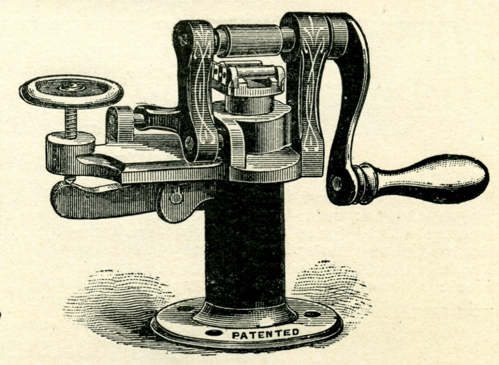 Slightly more expensive and more finely-tuned was the printers’ rule curver. The threaded screw on the left adjusts the lower pair of rollers on the right up or down. Rule is fed between upper and lower rollers and the handle on the right used to feed rule through. The different height of the smaller two rollers causes the rule to be bent as it leaves the machine. An advantage here is that by adjusting the screw while in progress it’s possible to create a spiral of rule.